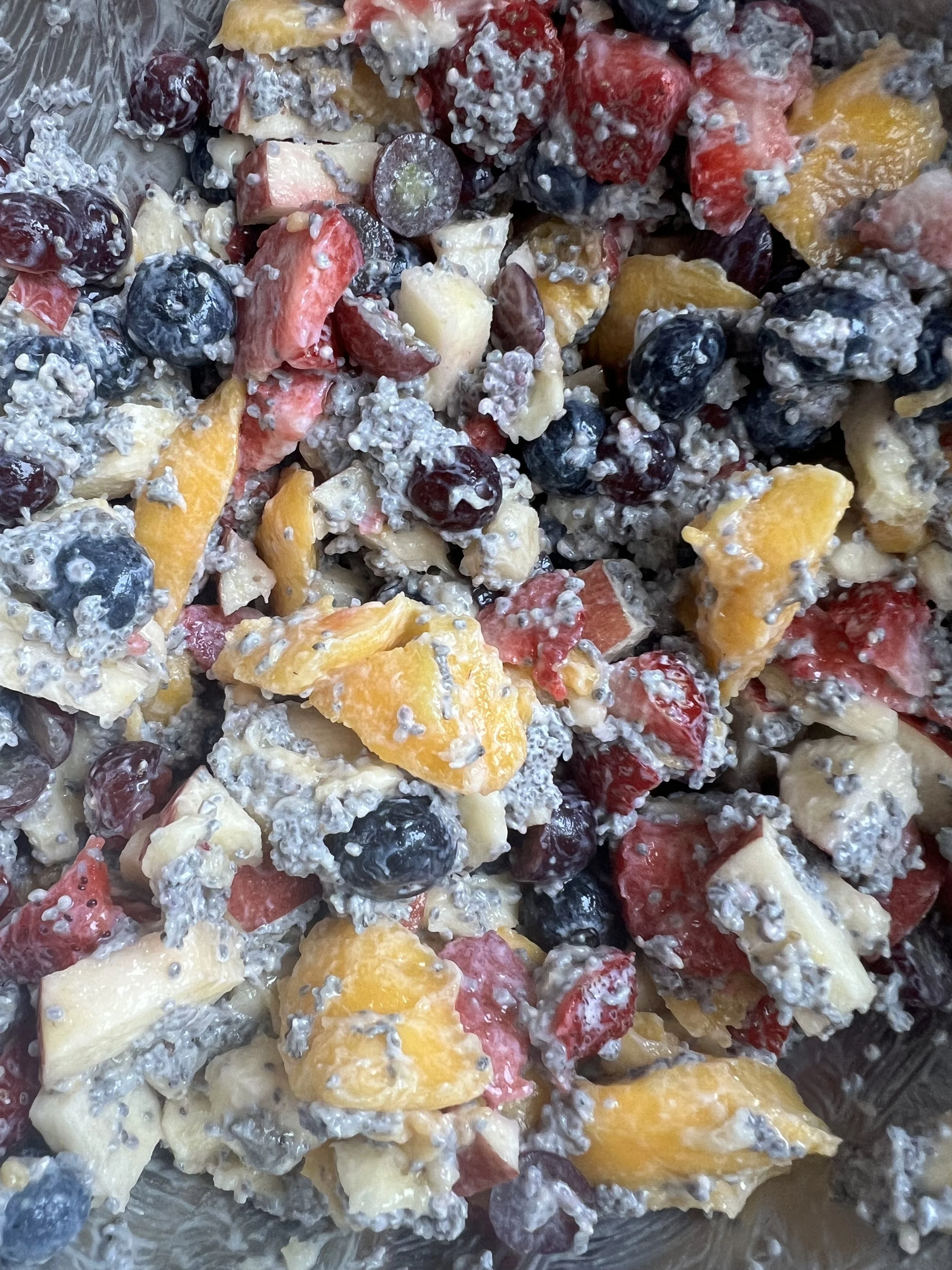 This health, yummy fruit salad is so easy, satisfying, and refreshing - perfect for a summer snack or to bring to a picnic. The protein and fat from the greek yogurt and seeds help prevent any blood sugar spike and will help keep you full. You can do any combination of fruit that you have on hand, but this is what I did.